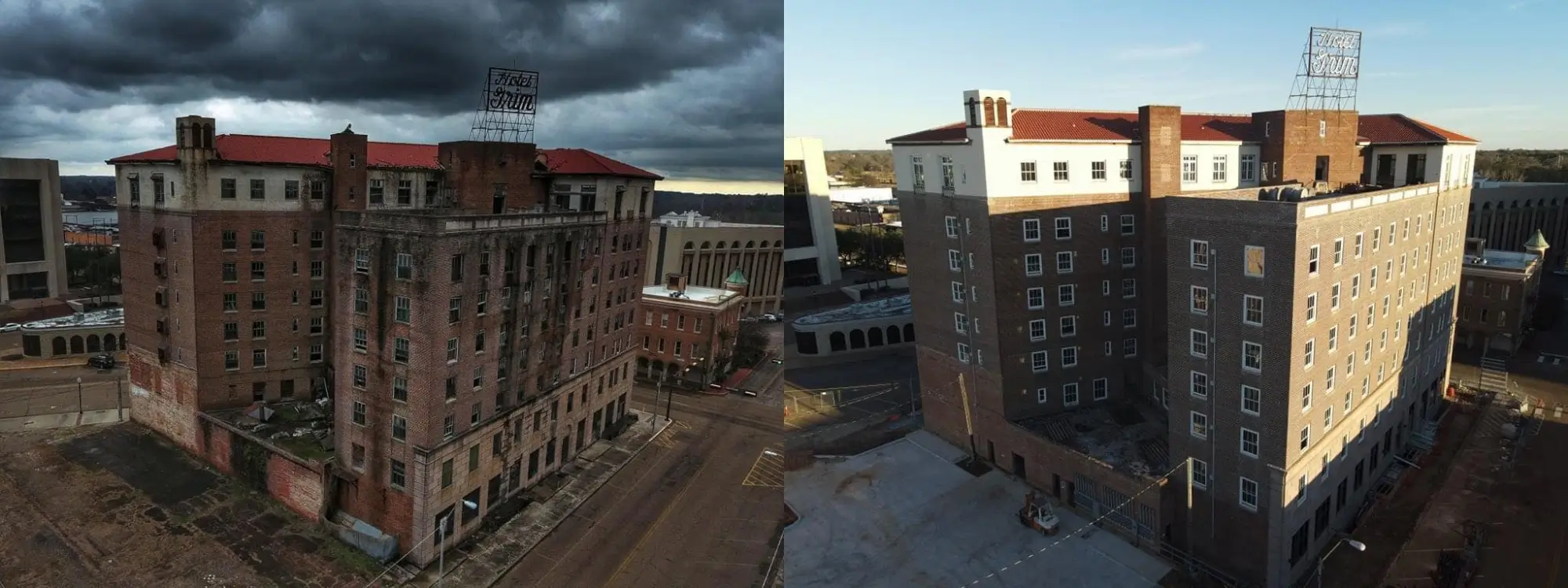 The historic Hotel Grim in downtown Texarkana has been brought back to life through an extensive redevelopment project — transforming the once-vacant landmark into The Lofts at the Grim, a vibrant mixed-use residential community. This large-scale renovation involved a full interior gut and rebuild, while preserving the building’s historic brick façade and architectural character. Our team supplied and delivered key construction materials, including drywall, acoustical products, insulation, and steel framing, supporting multi-story installation through precision jobsite logistics and high-reach delivery. Today, the Grim stands once again as a symbol of downtown revitalization — combining modern comfort with historic charm through thoughtfully designed apartments featuring contemporary finishes, natural light, and energy-efficient systems.